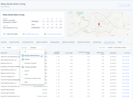 View connections between providers, buildings and geographies. See data on residents’ healthcare utilization and provider relationships: